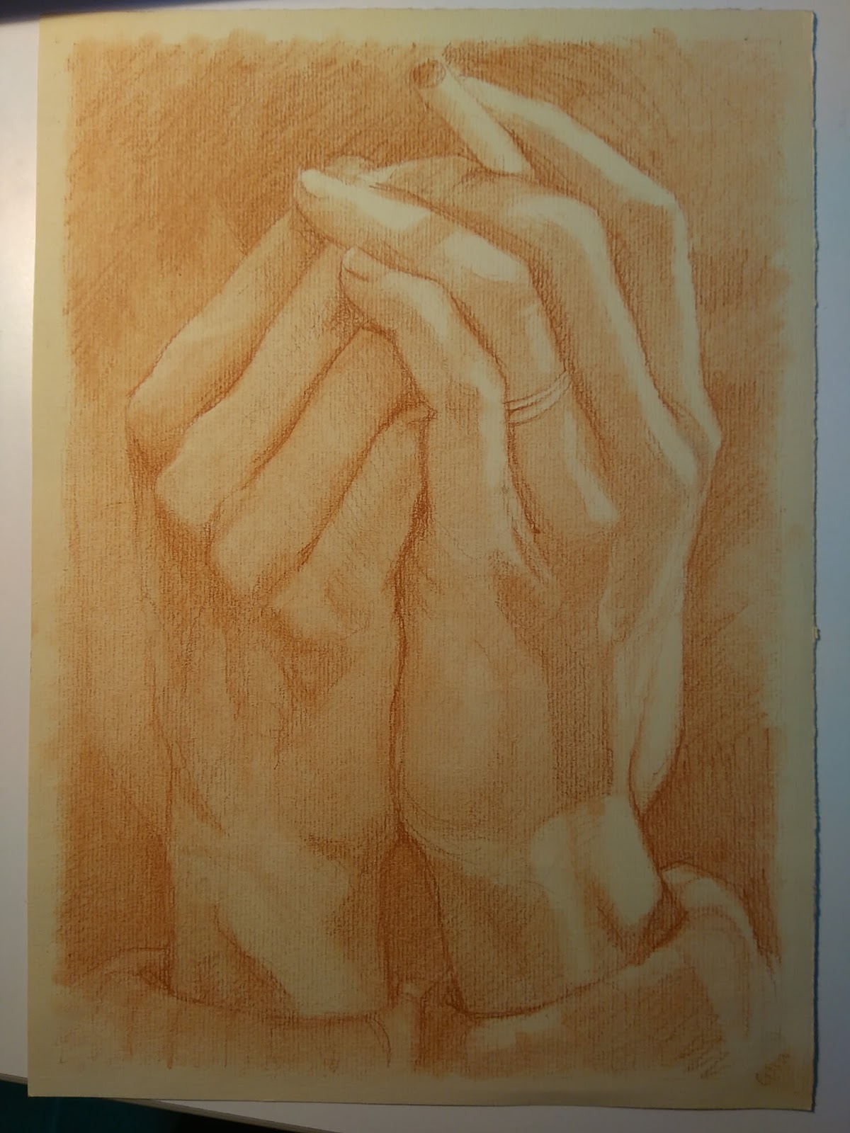 Poco a poco se sigue modelando el claroscuro con lápiz carbón y sanguina. El fondo de deja más difuminado para "alejarlo", mientras que en las manos se mantiene el trazo de los lápices para mayor expresividad. Las zonas que, una vez recuperado el tono del papel con la goma maleable, precisan más luz, se consigue con el clarión, en este caso barra blanca conté.
